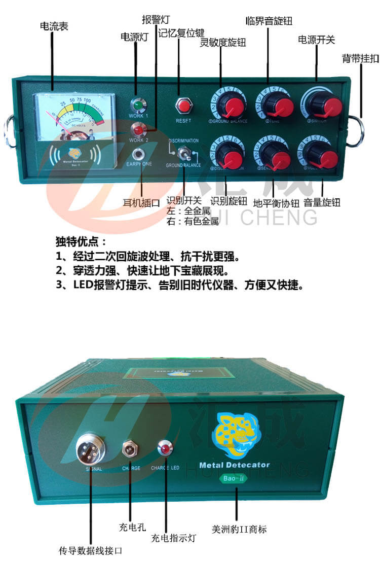 美國美洲豹地下金屬探測器是地下金屬探測器中性能特殊的 款,是款真正能達到理想探測深度的地下金屬探測器。 美洲豹地下探寶器采用美國新電子技術,內設地平衡線路,它的地平衡模式,能除 切“礦化反應”給探測器帶來的影響,而識別模式能區分被探測到的是有色金屬還是黑色金屬,大大提高了有效探測的深度及準確率,具有探測深度大、定位準確、分辨率強、操作簡單方便的特點。為了大限度的使用本產品的所有功能,在使用前請 仔細閱讀本說明書。