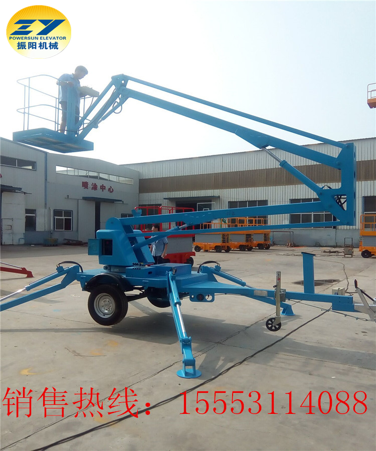 牽引曲臂式高空作業平臺:移動方便,曲臂結構緊湊.采用新型優質型鋼,強度高,重量輕,直接接入交流電或采用車自身動力啟動,架設速度快,具有伸縮臂,工作臺曲臂式高空作業升降車能懸伸作業、跨越 定的障礙或在 處升降可進行多點作業;http:/www.jnzhenyang.com平臺載重量大,可供兩人或多人同,平臺載重量大,可供兩人或多人同時作業并可搭載 定的設備;升降平臺移動性好,轉移場地方便;外型美觀,適于室內外作業和存放。適用于車站、碼頭、商場、體育場館、小區物業、廠礦車間等大范圍作業。曲臂式高空作業平臺按照臂展方式可分為直臂和曲臂兩種,多用于船廠等高度要求較高的場所,此類機器安全性較好,移動方便, 時作業并可搭載 定的設備;升降平臺移動性好,轉移場地方便;外型美觀,適于室內外作業和存放。適用于既可升高又可延伸,還可360度旋轉,易于跨越障礙物到達工作位置,是理想的高空作業設備.