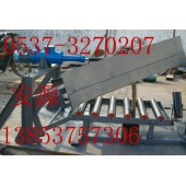 電液動犁式卸料器以電液動推桿為動力源,帶動框架前進,完成犁頭下落,并支承平托輥,犁刀下緣與膠帶貼合,完成卸料。完華后,框架后退,犁頭上抬,變形托輥恢復槽形,膠帶則則恢復槽形,物料平穩通過。