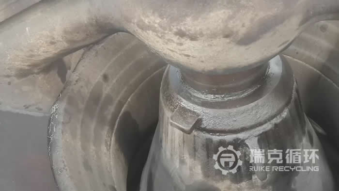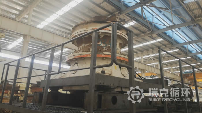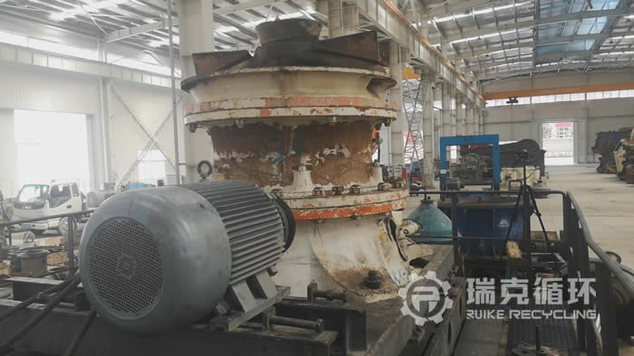 該臺美卓GP300S圓錐破碎機是我公司于2019年3月在陜西某地回收的,由于該地區對礦山行業進行整頓,該企業將設備裝讓給我公司。該設備除了外觀有明顯的銹跡之外,基本上沒有其它的損壞,我公司技術人員對該設備清洗之后進行了拆機檢查,發現核心零部件保存都比較完整,可以正常使用;動錐襯板、定錐襯板有磨損現象,重新更換。根據技術人員給出的修復方案,完成修復之后,在我公司的試機平臺上進行了試機運行,各項性能符合標準之后,將機身上面的銹跡清楚更干凈然后做防銹處理,并重新進行噴漆。