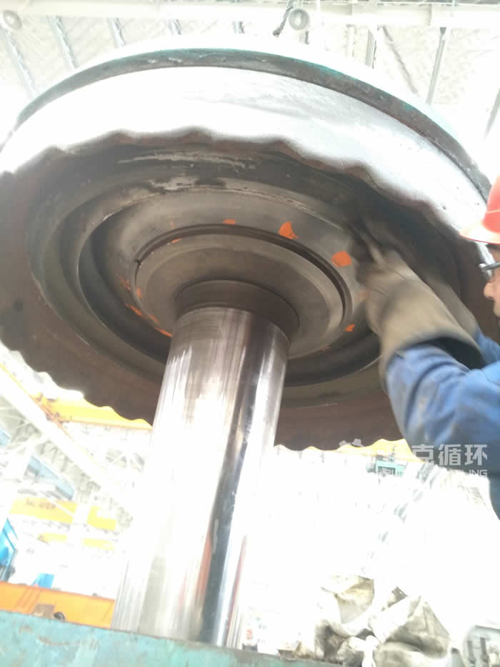 在打磨齒輪時 在小齒輪上沿旋轉方面的 面涂滿紅丹粉,然后放入動錐用天車輕吊別放實然后手動旋轉皮帶輪,等動錐轉 圈后再停止,然后吊起看大齒輪上的紅丹粉痕跡。用磨光機把紅丹粉痕跡磨掉,不能磨得過很也不能只磨 點,每磨 次就要試下接觸率。非常麻煩。好后調傳動軸側隙。安裝試機后,運行良好。