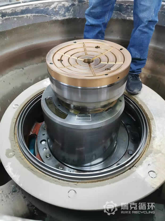 該設(shè)備原為內(nèi)蒙武川選礦廠設(shè)備,因擴選廠規(guī)劃到保護區(qū)。設(shè)備處置拉回廠里進行了檢修,主機拆開檢測,平衡圈磨損嚴重、偏心襯套下沉、架體襯板進行更換、釋放缸及鎖緊缸漏油。然后進行整體修復(fù)。
