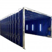 2.移動(dòng)龍門架結(jié)構(gòu)是伸縮式噴漆房的伸縮牽引支架,它包括了龍門架、伸縮移動(dòng)驅(qū)動(dòng)架、伸縮警示燈。伸縮動(dòng)力裝置即伸縮移動(dòng)架及安裝在伸縮架上的驅(qū)動(dòng)電機(jī)、減速箱、主動(dòng)輪及其傳動(dòng)系統(tǒng)。移動(dòng)龍門架安裝在伸縮驅(qū)動(dòng)架上。