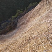 被動網(wǎng) 由鋼絲繩網(wǎng)或環(huán)行網(wǎng)(需攔截小塊落石時附加 層鋼絲格柵)、固定系統(tǒng)(錨桿、拉錨繩、基座和支撐繩)、減壓環(huán)和鋼柱四個主要部分構(gòu)成,前者為起特征構(gòu)成。起防護能量 般為150KJ~2000KJ,特殊設(shè)防能高達5000KJ。被動系統(tǒng)根據(jù)起防護能量、結(jié)構(gòu)形式和特征構(gòu)成的不同分為三類:RX型和RXI型、AX型和AXI型、CX型和CXI型。